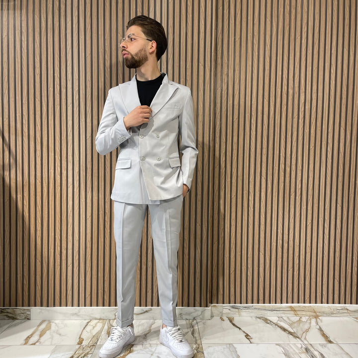 Nuova collezione abito doppiopetto prodotto 100% Made in italy, pantalone modello Capri con risvoltino cucito giacca doppiopetto con tasche sul davanti calzata regular, il modello in foto indossa taglia 46 e veste dalla 44 fino alla 56.