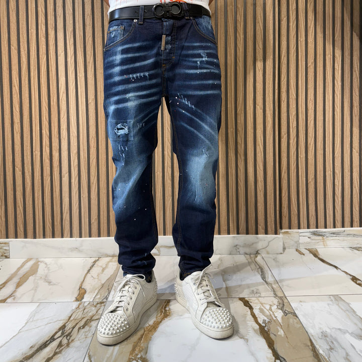 Jeans lavaggio scuro vestibilità regular con piccola rottura con toppa interna , chiusura a bottoni