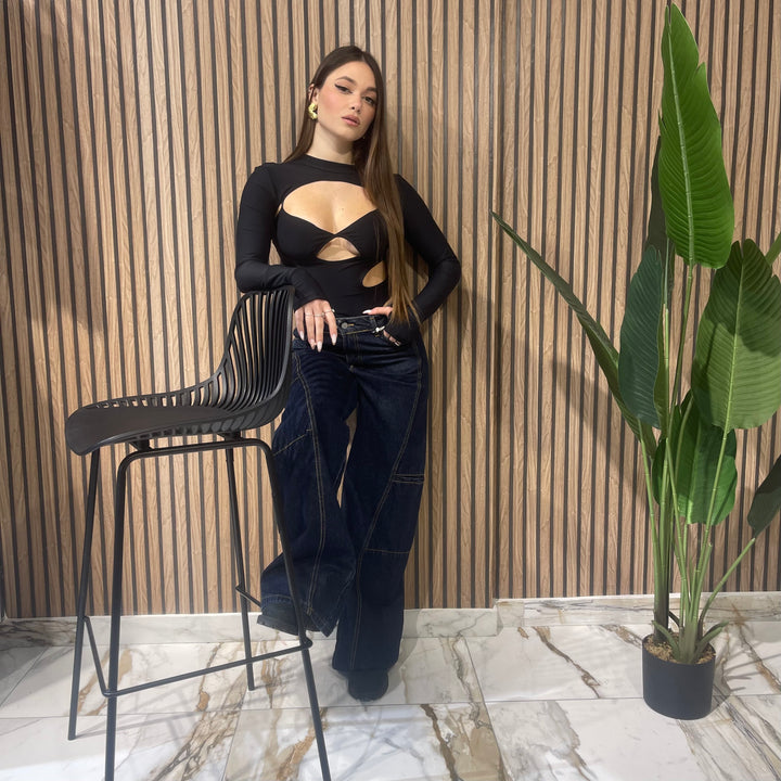Body in lycra cut out sul davanti e sui fianchi. Con bretelle regolabili e cardigan rimovibile a maniche lunghe con manica a guanto. Disponibile in due colorazioni. Taglia unica.
