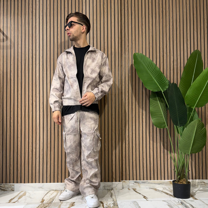 Coordinato marmorizzato con pantalone cargo e giacca vestibilità croop veste dalla taglia S alla XXL, il modello in foto indossa taglia M.