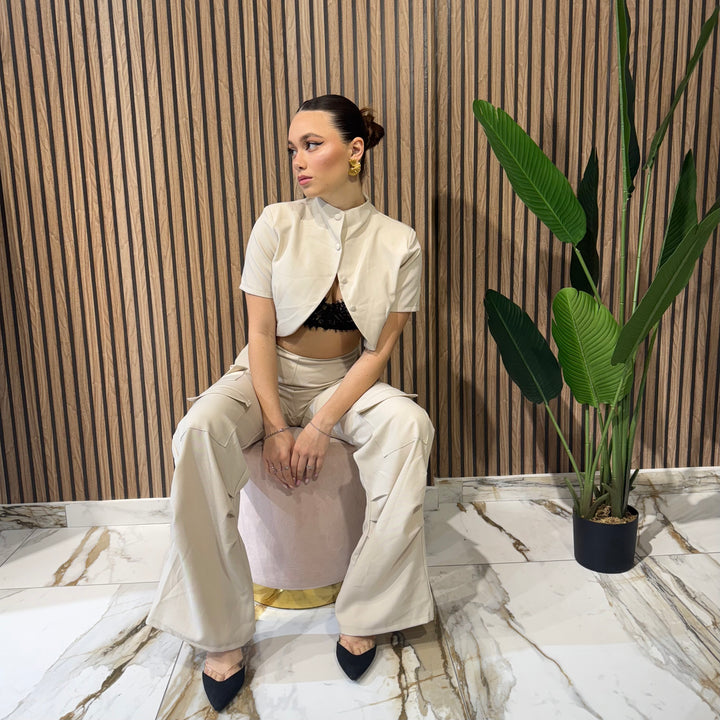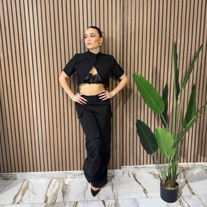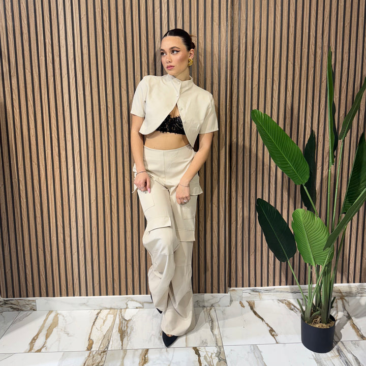 Nuova collezione coordinato due pezzi composto da pantalone cargo, e giacca crop con chiusura a bottoni , tg unica.