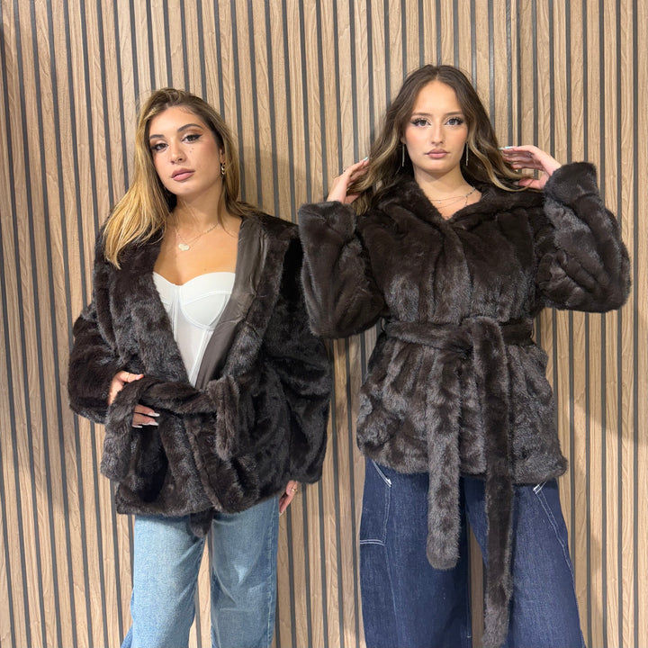 Eco pelliccia effetto visone con cappuccio e cintura in vita con chiusura a bottoni a scomparsa taglia unica.