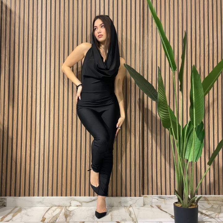 Jumpsuit hood con scollatura americana convertibile anche in cappuccio. Schiena scoperta. Disponibile in due colorazioni. Taglia unica.