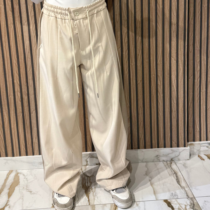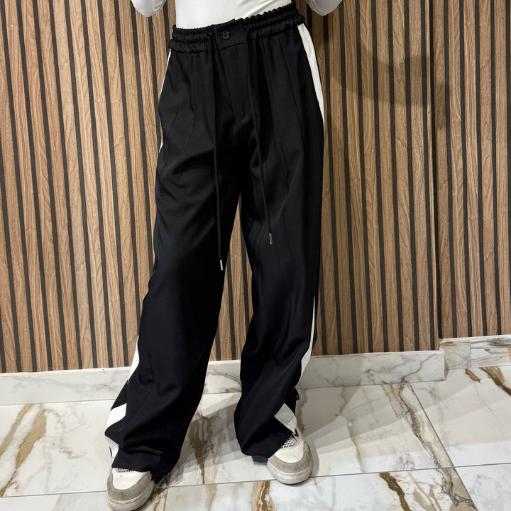 Pantalone con banda laterale fondo ampio veste dalla taglia unica disponibile in tre colori.