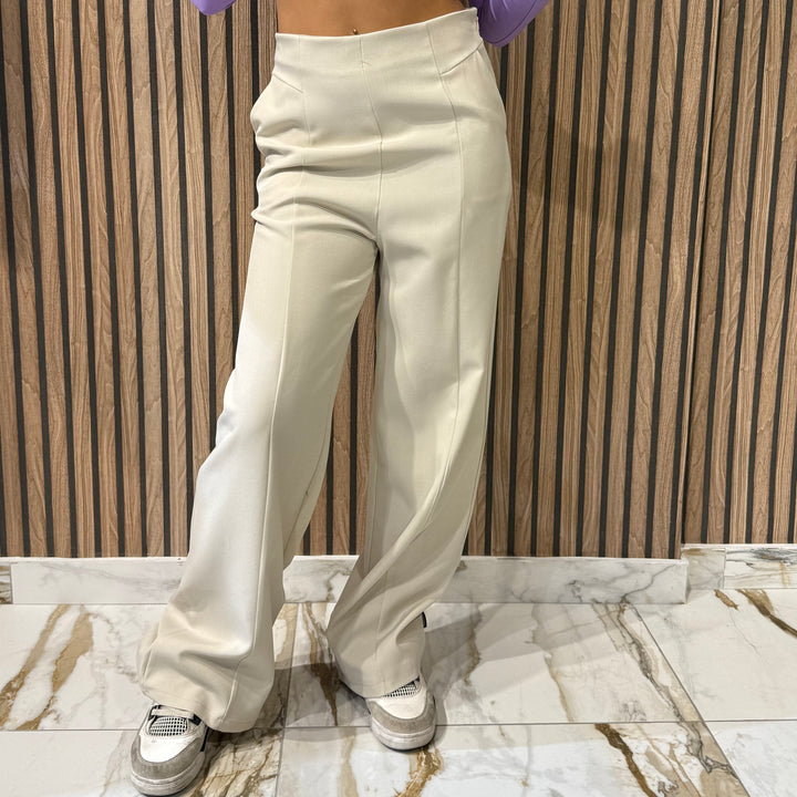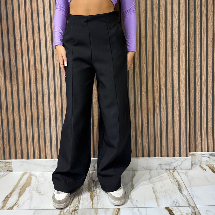 New pantalone con fondo ampio disponibile in due colori , veste da una taglia S alla L. La modella in foto indossa taglia S.